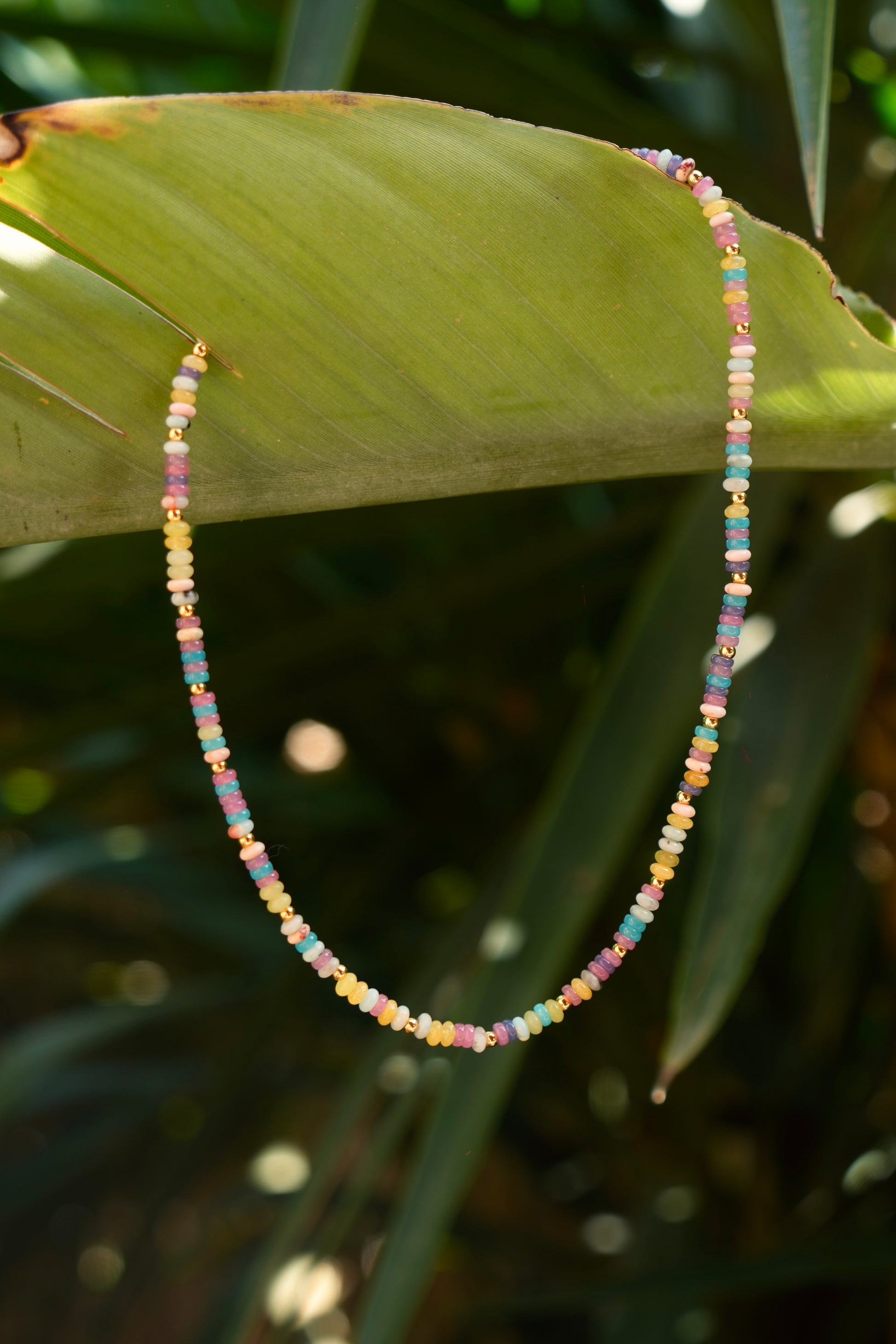 Collar hecho de piedras naturales facetadas en tonos multicolor y cuentas de acero inoxidable bañado en oro de 18k.