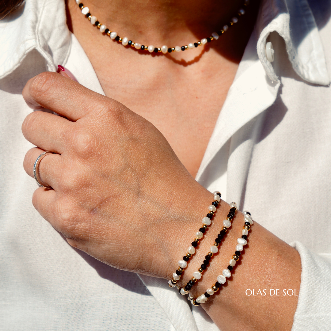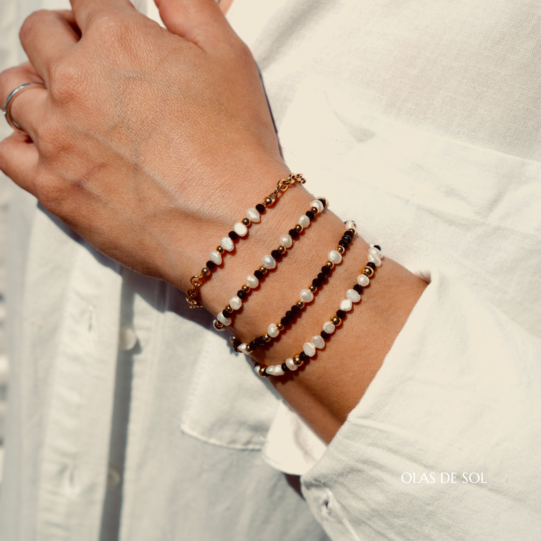 Estás pulseras, elaboradas con nácar y cristal, capturan la magia de esas veladas junto al mar, cuando todo parece más ligero, más bonito, más libre.